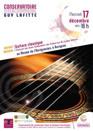 Le mercredi 17 décembre à 16h, retrouvez en concert la classe guitare du Conservatoire. 7 élèves et leurs professeurs dont la sensibilité et la maîtrise promettent un instant musical d’exception. Leur musique vous entraînera dans un voyage sonore mêlant finesse, virtuosité et émotions partagées.